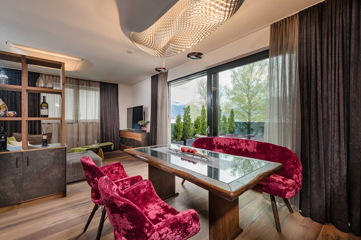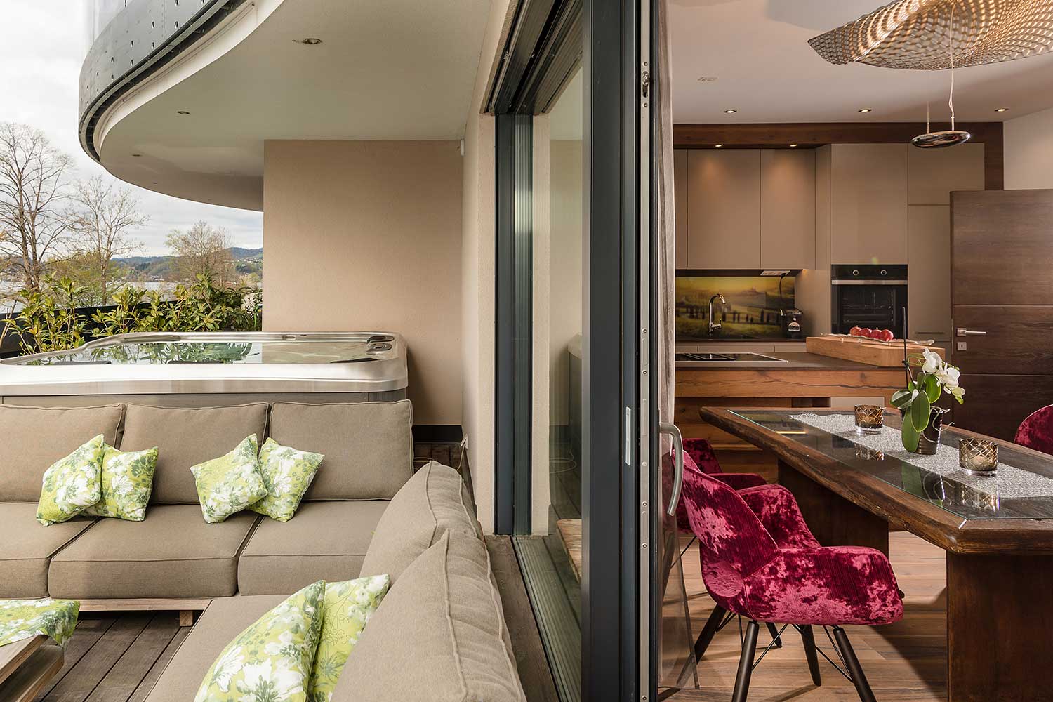 1 Schlafzimmer mit Boxspringbetten und jeweils TV, ausgestattete Wohnküche (Elektroherd, Backofen, Geschirrspüler, Kühl- und Gefrierschrank), großem Esstisch sowie Couch mit großem Flat-TV, Bad mit Whirlwanne, Dusche, WC, Pissoir extra, Vorraum mit Garderobe, Abstellraum mit Waschmaschine. Ein weiteres Highlight der Wohnung ist die große Terrasse mit, Lounge sowie der Berg- und Seeblick.